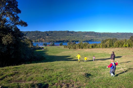 Die Kinder rennen die Wiese hinunter