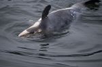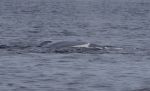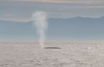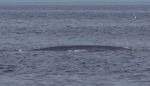 So gerne wir die Fluke gesehen hätten, ist der Wal heute nicht dazu aufgelegt sie uns zu präsentieren. Im Gegensatz zu Buckelwalen, die sehr häufig aus dem Wasser springen und beim Untertauchen häufig mit der Fluke auf das Wasser schlagen, bekommt man eher selten die Gelegenheit die Fluke eines Blauwales zu sehen. Dafür kommt das Tier so nah an uns, dass wir beim nächsten Auftauchen seine feuchte grauschwarze Haut, die wölbenden Wirbeln des Rückgrates, die kleine Finne und sein zweigeteiltes Blasloch ganz gut sehen können. Leider ist der Spaß ziemlich kurz. Der Wal zieht auf der Suche nach Nahrung schnell weiter. Nur seinen Blas können wir noch einige Zeit lang in der Ferne sehen.