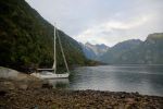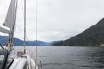Nach der Begegnung mit dem Wal frischt der Wind ein wenig auf, und wir können auch einige Meilen segeln. Am Eingang des Esteros kommt uns eine ziemlich unangenehme steile Welle entgegen. Von vorne, wie immer. Es ist nichts Kritisches, ist aber trotzdem verwunderlich, wie sie bei einem ziemlich kurzen Fetch und kaum nennenswertem Wind zustande kommt. Laut dem Revierführer besitzt der Estero Cahuelmo eine „evil reputation“. Seine steilen Wände bieten im Falle von Starkwind keinen Schutz vor dem Wind. Ganz im Gegenteil führt seine Topographie dazu, dass die Winde noch verstärkt werden, und die daraus resultierenden Fallböen hier beim schlechten Wetter verirrtes Boot von allen Seiten brutal angreifen. Platz ist zwar genug da, aber für freies Ankern ist der Fjord zu tief. Für uns heute kein Problem – das Wetter soll windarm bleiben.