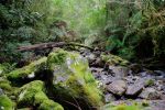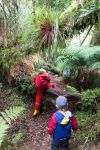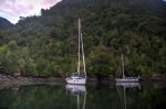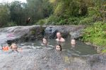 Wir lassen das Dighy vor Anker schwimmen und laufen dem Pfad nach, der durch einen alten Regenwald führt. Die Vegetation wächst in mehreren Etagen. Von riesigen Bäumen hängen Bromelien und Lianen herunter. Im Gebüsch hüpfen am Boden relativ große braune Vögel. Nach einer ziemlich kurzen Strecke endet der Pfad. Wir kehren zurück und suchen ohne Erfolg weiter. Die Kinder entdecken einen kleinen Steg, aber auch der ist vollkommen überflutetet. Schließlich steigt Natalya ins Dinghy und rudert herum, so schnell wollen wir nicht aufgeben. Endlich, tief im Gras versteckt entdeckt sie ein kleines Holzschild: „Termas“.