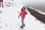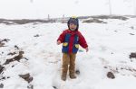 Zu allem Überfluss zieht der Himmel jetzt komplett zu und es fängt sogar an zu schneien, mit der Zeit sogar recht heftig. Und nochmals schlechte Vorbereitung: Wir haben weder Mützen noch warme Jacken dabei! Trotz der Kälte wollen unsere Kinder unbedingt aussteigen und im Schnee zu tollen. Schnee sorgt jedes Mal für Begeisterung. Dieses Mal ist es aber wirklich nicht einfach. Statt lockerem Schnee treffen sie eher auf harten Firn, der nicht mal unter unserem Gewicht nachgibt. Trotzdem haben sie Spaß und gehen nur widerwillig zurück zum Auto. Wir durchforsten unser Gepäck nach etwas Essbarem und finden zwei-drei Brötchen und eine Banane. Gut, dass wenigstens Arvid nicht mehr vom Verhungern akut bedroht ist.