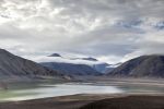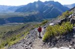 Von oben sieht die Gegend atemberaubend aus. Steile, schroffe Berge säumen die Ufer des Sees, ein Fluss schlängelt sich durch das Tal. Als wir endlich am Grat ankommen werden wir durch den freien Blick auf den schneebedeckten Gipfel des Vulkans belohnt. Wir versuchen noch einige Meter höher auf den nächsten Hügel zu steigen, um einen noch besseren Blick zu bekommen. Aber so anziehen das ist, und so verlockend der weitere Pfad aussieht – wir müssen zurück zu den Kindern. Sie werden sich an einem schmalen Pfad mitten im Nichts wohl langweilen … denken wir.