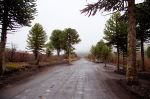 Das Abstempeln der Pässe bereitet keine Problemen. Im Gegensatz zu Puerto Natales gehen wir nicht ganz frech wieder an das Fenster um auszureisen, sondern fahren von der Grenze weg. Der nächste Ort auf der argentinischen Seite ist 50 km entfernt, und ist nicht wirklich sehenswert. Wir steigen ein paar Kilometer von der Grenze entfernt aus und entdecken einen viel versprechenden Wanderweg durch die Araukarienebene mit der Sicht auf Lanin. Leider spielt heute das Wetter nicht mit. Es ist zu kalt, und es nieselt. Daher hat Arvid heute keine Lust aus dem Auto auszusteigen. Nach weniger als einer Stunde erscheinen wir wieder an der Grenze… und es gibt Probleme. Die Argentinier haben ganz klar verstanden, dass wir bloß einen Stempel brauchen und reden uns ins Gewissen, dass man das Thema so nicht behandeln soll. Warum eigentlich nicht? Gesetzwidrig ist das nicht. Wir versuchen zwar den Anschein zu bewahren, dass wir doch nach Argentinien wollten um eine Tagestour zu unternehmen, aber so richtig glauben tut es keiner. Naja, was soll es, die Ausreise können sie uns wohl nicht verbieten.