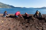 Am Nachmittag gehen wir noch am Ufer des Sees spazieren. Auch wenn wir uns in Pukon schon fast häuslich eingerichtet haben und die Kinder auf keinen Fall freiwillig „ihr“ Kätzchen verlassen wollen, müssen wir weiter fahren. Unsere Reise dauert schon jetzt länger als geplant und wir sind immer noch einige Hundert Kilometer von der Outer Rim entfernt. Aber direkt nach Puerto Montt zu fahren haben wir noch keine Lust. Daher fällt die Wahl auf eine Strecke über Landstraßen, die Route der sieben Seen. Nach einiger Zeit im Auto steigen wir am Ufer des Lago Calafquen aus. Der Strand ist absolut menschenleer. Trotz der Sonne, ist das Wetter frisch und windig. Unsere Kinder stört das nicht. Sie lassen sich am Strand nieder und bauen Vulkane. Fein säuberlich sortieren sie die roten Steinchen aus, um daraus Lavaströme zu formen.