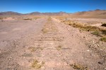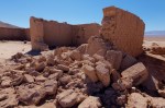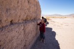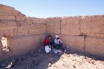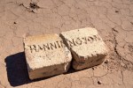Für die Mittagspause halten wir an einer Ruine an, in der Hoffnung einen kleinen Fleck Schatten dort zu finden. Die Mauern aus Lehm und Ziegelsteinen lassen ihr Alter nur schwer einschätzen. Zu gut wird in der trockenen Luft der Wüste alles konserviert. Die Kinder entdecken mitten in der Anlage große mit Teer gefüllten Becken, allerdings ist er schon längst ausgehärtet. Als Thomas beim Spazierengehen Reste einer alten Eisenbahnlinie hinter der Anlage entdeckt, rechnet Vsevolod eins und eins zusammen und identifiziert die Ruinen als ein Lager für den Eisenbahnbau. Die Teerbecken dienten wohl dazu, Holz durch Tränkung mit Teer haltbar zu machen. An einer der Mauer findet Natalya zwei Bruchstücke, die zusammen einen kompletten Ziegelstein ergeben, mit Namen des Herstellers darauf. Eine spätere Recherche ergibt, dass diese schottische Fabrik vor mehr als 100 Jahren aufgehört hat zu existieren. Somit sind die Reste der Eisenbahnlinie älter als Hundert Jahre. Wenn dafür sogar die Ziegeln aus Schottland importiert werden mussten, fragt man sich schon, was man sonst für den Aufwand zustande brachte, um die Strecke fertig zu stellen… und heute liegt sie brach.