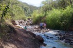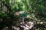 Der Nebelwald ist licht, es ist kein alles überwuchernder Dschungel. Angeblich gibt es hier auch Tiere, sogar Jaguare, aber unsere Kinder schrecken zuverlässig alles ab was nur irgendwie in unsere Nähe kommen könnte. Der Weg führt uns zu einer kleinen Lagune hinunter, die so voll mit Wasserpflanzen bedeckt ist, dass kein Wasser mehr zu sehen ist. Eine Viertelstunde später machen wir an einem lebendig plätschernden Bach Rast. Die Kinder gehen sofort ans Wasser und versuchen Dämme zu bauen. Thomas begibt sich auf Schmetterlingsjagd. Einige flattern direkt am Ufer. Wenn sie sich hinsetzen und ihre Flügel zusammenklappen, sieht man sie auf dem braunen Lehm gar nicht mehr. Klappen sie die Flügel auf, sind sie wieder farbenprächtig.