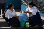 Auch die Märkte von Otavalo werden von unserem Reiseführer hoch gepriesen. Auf dem Gemüsemarkt bedauern wir, dass wir hier keine Kochmöglichkeit haben. Die Auswahl an Frucht und Gemüse ist beeindruckend. Alles frisch vom Feld, und in der Sonne gereift. Es gibt keine Gewächshäuser, in denen Tomaten vor der Natur versteckt werden, oder Kühlschränke wo sie wochenlang liegen könnten. Die Farben sind wahnsinnig intensiv. Im Vergleich dazu wirkt der Viktualienmarkt in München eher ärmlich und bescheiden. Auch die Atmosphäre passt. Während Frauen auf die Käufer warten, schälen sie Mais und Bohnen. Wer kein Sonnendach hat, legt sich auf den Kopf ein dickes, gefaltetes Tuch als Schutz vor der Hitze. Gegen Mittag wird es so nah am Äquator trotz der Höhe fast unerträglich heiß.
