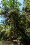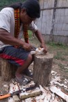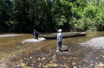 Bevor wir mit dem Kanu einen kleinen Ausflug machen können, müssen erstmal die unzähligen Lecks gestopft werden. Der alte Einbaum ist ziemlich rissig und läuft ganz sicher in kurzer Zeit voll, wenn man diese Ritzen nicht stopft. Überraschenderweise wird zum Kalfatern kein Pech oder Teer genutzt, sondern weißer Lehm. Bevor wir ablegen, packt unser Führer einen großen Klumpen mit ein. Das Kanu gleitet lautlos durch den ruhigen Fluss. An manchen Uferstellen kann man deutliche Tierspuren sehen. Hätte man mehr Zeit und genug Geduld, würde man hier einen Tapir zum Gesicht bekommen.