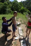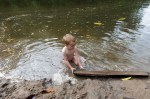 An einer Stromschnelle muss das Boot gedreht und durch das flache Wasser gezogen werden. Wir machen einen kurzen Halt am nächsten Hof. Unser Führer leiht sich von seinem Bruder einen großen Metallhaken für die Fischjagd. Den bindet er mit einer Schnur an einen frisch geschnittenen Speer und taucht so bekleidet wie er ist, ins Wasser ein. An dieser Stelle säumen viele kleine Unterwasserhöhlen das Flussufer, in denen der gesuchte Fisch haust. Der Indianer taucht sie eine nach der anderen ab, aber leider ist heute kein Fisch zuhause. Im Gegensatz zu den Netzen, ist das die traditionelle Art zu fischen. Etwa eine halbe Stunde lang dauert die Jagd. Arvid ist müde, und schläft fast ein. Am Rückweg wird er wieder agil und möchte selber den Kahn stochern. Mit einem kleinen Stecken hilft er mit.