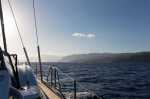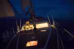 Der Wind frischt auf. Hat Natalya in den Nächten vorher nicht schlafen können, weil die Segeln ohne Wind geschlagen haben, kommt sie jetzt nicht zur Ruhe, weil sich die bis zu 10 Knoten schnelle Fahrt im Schafzimmer sich wie ein Raketenflug anfühlt. Hinten am Heck, nah an die Wasserlinie, hört man deutlich, wenn das Boot ins Gleiten gekommen ist. Aber das Vergnügen ist von kurzer Dauer. Ein Tag mit gutem Wind muss reichen … für die ganze Überfahrt.