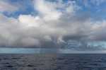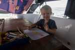Endlich kommt am nächsten Morgen etwas Wind, dass wir wieder Segel setzen können. Wir segeln Raum mit bis zu 7 Knoten, was für eine Rauschefahrt im Vergleich zu den letzten Tagen. Thomas feiert heute Geburtstag. Die Kinder haben Geschenke vorbereitet, Natalya einen Kuchen gebacken: den ersten auf hoher See. Pünktlich zum Anschneiden des Kuchens taucht keine zehn Meter entfernt eine große schwarze Rückenflosse auf: gefühlt einen halben Meter hoch. Natalya schreit zuerst: „Haie!“ Doch das Meer hat Thomas ein sehr viel selteneres Geschenk geschickt. Es sind kleine Schwertwale, die Verwandten der Orca. Ein Wal kommt so nah, dass wir ihm beim Schwimmen unter Wasser zuschauen können. Einige der Tiere springen vollständig aus dem Wasser. Klar sind ihre abgerundeten Köpfe erkennbar.