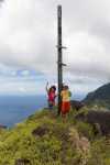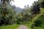 Fatu Hiva, im äußeren Südosten des Archipels gelegen und damit eine der jüngsten Inseln, hat seine 600 Einwohner auf zwei kleine Ortschaften verteilt. Die einzige Straße auf der Insel verbindet Hanavave, in dessen Bucht wir ankern, mit Omoa und führt über einen hohen Kamm. Von hier aus soll man einen guten Blick auf die tiefen Täler und schroffen Berghänge der Insel haben. Also wollen wir dorthin wandern. Lange und steile Wanderungen in praller Sonne sind für unsere Kleinen nichts. Daher geht Thomas mit Franka und Vsevolod los. Frisches Trinkwasser für die Wanderung gibt es am Wasserhahn im kleinen Hafen. Und schon laufen wir die schmale Straße entlang, aus Hanavave heraus und den Berg hinauf. Die Straße ist wohl gerade so steil, dass Vierrad-getriebene Fahrzeuge noch hochkommen.
