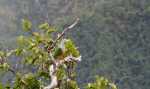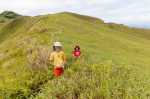 Erst mal erkunden wir eine kleine Felsspitze am Ende eines Grates 100 m weiter. Von dort haben wir einen tollen Blick nach unten und oben. Es wird klar, dass der Weg nach unten definitiv nicht möglich ist. Also nach oben. Zurück woher wir gekommen sind? Umkehren ist nicht so unser Ding. Es muss eine andere Möglichkeit geben. Vsevolod prüft die Lage und klettert auf den Grat. Der Hang ist steil, felsig und mit wenig Bewuchs zum Festhalten. Von oben kommt dann das Okay, dass wir hier vielleicht weiter nach oben laufen können. Also krabbelt Thomas auf allen Vieren den Kindern hinterher bis zum Rücken des Grats. Hier erlaubt die Vegetation ein Vorwärtskommen, wenngleich mühsam. Wir kämpfen uns durch die Büsche immer weiter nach oben. Erschwert wird das noch dadurch, dass die Keen-Sandalen von Thomas eingerissen sind. Damit ist kein ordentlicher Halt mehr auf dem Boden zu bekommen. Immer wieder rutschen die Füße weg. Mit einer Schlammschicht an den Füßen läuft es sich wie auf Eis. Weiter oben ist im Berghang ein Schatten im Gras erkennbar. Scheinbar bzw. hoffentlich verläuft dort ein Weg. Dieser verläuft recht horizontal entlang des Hangs und könnte uns zurück zur Straße bringen.