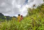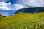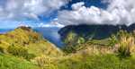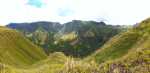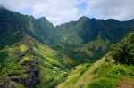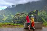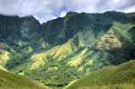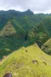 Schon recht weit oben am Berg hält ein Auto neben uns. Und es war in den 1,5 Stunden bis hierher das einzige Auto auf dieser Straße! Es ist eine Familie, die von Hanavave zum Einkaufen nach Omoa fährt. Angeblich gibt es dort ein etwas breiteres Warenangebot. Das ist auch leicht zu glauben, gibt es doch in Hanavave nur einen kleinen Krämerladen in einer Handvoll Artikel. Wir bekommen für eine kleine Strecke eine Mitfahrgelegenheit auf der Rücksitzbank. Omoa war ja nicht unser Ziel sondern eigentlich nur die Spitze des Passes, damit wir einen schönen Blick auf die Täler bekommen. Wir steigen also schnell wieder aus und laufen etwas abseits der Straße über eine Wiese. Oder eigentlich ist es keine Wiese sonder ehr mit kniehohen harten Büschen bewachsen. Jedenfalls kommen wir so näher an einen Aussichtspunkt. Wir genießen den Anblick den uns die fast im Halbkreis verlaufende Felswand uns bietet. Steil fällt sie ab, ist durchfurcht von vielen kleinen und großen Schluchten und oben abgeschlossen durch eine zackige Krone. Es lassen sich kleine Höhlen, Überhänge und Kanten erkennen. Alles, außer die steilsten Stellen, ist mit dichter grüner Vegetation bedeckt. Man hat das Gefühl, vor einer grünen Wand zu stehen.