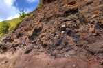 Wir schnaufen jedenfalls recht schnell, und die heiße Sonnenstrahlung trägt dazu bei, dass sich die Wasserflaschen schnell leeren. Gut, dass am Straßenrand eine kleine Quelle erscheint. Inmitten des nett angelegten Beckens steht eine kleine Marienstatue. Im Wasser sehen wir kleine Flusskrebse. Wir erfrischen uns und weiter geht’s. Immer höher schlängelt sich die Straße, an jeder Biegung hat man neue tolle Ausblicke auf die Insel und die Buchten im Westen. Ab und zu ist auch die Outer Rim noch zu sehen. Irgendwann geht der Weg von Betonpiste auf eine Schlamm/Stein-Kombination über. Das Fortkommen wird deutlich mühsamer, tragen die Schuhe doch immer wieder Erdbrocken mit sich. Je höher wir kommen desto dünner wird die Vegetation. Bäume werden durch Gräser und niedrige Büsche abgelöst.