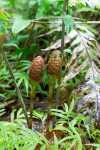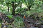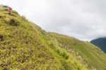 Ein kleiner Trampelpfad ist vor uns erkennbar. Er führt in das vor uns liegende Tal hinein. Wir sehen auch den Wasserfall, den wir am Tag zuvor erwandert haben. Führt der Pfad vielleicht zum Wasserfall? Sollen wir lieber über die Wiese zurück zur Straße laufen oder uns auf ein Abenteuer einlassen? Der Pfad ist steil, abschüssig, schlammig nass und ohne ordentliche Vegetation zum Festhalten. Wenn wir den Weg gehen, dann gibt es wohl kein Zurück, oder jedenfalls nicht ohne größere Probleme. Wir diskutieren kurz, dann setzen wir uns auf den Hosenboden und schlittern den Pfad abwärts. Hie und da gibt es Wurzeln, an denen wir abbremsen können. Ab und zu halten wir uns an einem Ast fest, der aber dann wieder abbricht. Nach einigen Höhenmetern kommen wir in flacheres Gelände, wieder unter Bäumen und mit dichter Vegetation. Der weitere Verlauf des Pfades ist schnell gefunden. Hm, so richtig breit ist der Pfad aber nicht.
