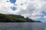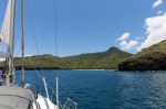 Unser Gemüsevorrat geht zwar zu Neige, aber wir entscheiden uns vernünftigerweise doch gegen das Anlanden im Dorf Vaitahu am Betonpier ohne Wellenbrecher. Den Spaß Wellen zu zählen, blitzschnell aus dem Boot auf den Pier springen und auf gleicher Weise mit dem Einkauf wieder zurück sparen wir uns lieber für ein anderes Mal auf. Hatten schon auf Fatu Hiva genug Spaß, den einen oder anderen Brecher persönlich begrüßen zu dürfen. Gemüse gibt es daher heute keins, dafür hat die kleine Siedlung Internet, welches wir dank Antenne auch an Bord empfangen. Nachdem wir unsere Emails abgerufen haben, fahren wir in die nächste Bucht, nach Hanamoenoa. Auf dem Weg begleiten uns einige Delfine. Auch als wir in die Bucht einlaufen, kommen uns einige Delfine entgegen. Natalya will gleich zu ihnen ins Wasser springen. Doch bis wir unser Ankermanöver abgeschlossen haben, sind sie leider schon weg. Wir liegen jetzt in der wohl einzigen Bucht der Marquesas mit relativ klarem Wasser.