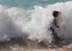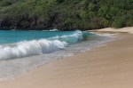 Der Strand fällt überraschend tief ab. Schon nach wenigen Metern kann man nicht mehr stehen. Der ankommende Schwell türmt sich auf dem kurzen flachen Stück ordentlich auf. Während das ans Ufer geschmetterte Wasser den Weg zurück ins Meer sucht, kommt schon die nächste Welle an. Zwei Kräfte prallen aufeinander: oben bricht die Welle, unten zieht es einem buchstäblich den Boden unter den Füßen weg. Unsere Großen finden mächtig Spaß daran, von den Wellen kräftig umspült zu werden. Nachdem sie genug Spaß in der Waschmaschinentrommel gehabt haben, finden sie heraus, dass man das Überspülen auch vermeiden kann, indem man in die Welle eintaucht.