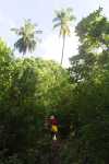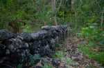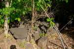 Auf einem gut ausgetretenen Pfad gehen wir durch das Dorf in den Wald hinein. Am Dorfausgang steht ein Paar Badelatschen ordentlich beisammen mitten auf dem Weg. Hier hat wohl einer seine Dorfschuhe gegen Wanderschuhe getauscht. Natalya sammelt am Boden unzählige Mangos. Die sind so reif, das sie es nicht mehr bis zum Boot schaffen. So werden sie direkt aufgegessen. Wir kommen an Spuren einer alten Siedlung vorbei. Viele sog. Paepae, also alte Steinfundamente, sind im Wald verteilt und teilweise dicht mit Vegetation überdeckt. Mehrmals überqueren wir ein ausgetrocknetes Flussbett. Der Breite nach zu urteilen, ist mit dem Flüsschen nach dem Regen nicht zu spaßen. Das Wasser rast von den Bergen Richtung Meer hinunter und nimmt alles mit, inklusive Palmenstämme.