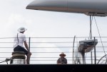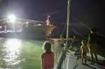 Wir sehen aus unserem Dinghy, dass einer der beiden Heckankerleinen unter dem Rumpf liegt und nutzen unseren ganzes Französisch, um die Situation zu erklären. Obwohl wir uns sicher sind, die Crew hat uns verstanden, starten sie den Motor, kurzer Ruck, der Motor geht nicht mehr. Mit Maske, Flossen und Taschenlampe taucht der Eigner ins pechschwarze Wasser. Die kurze Untersuchung zeigt (was denn sonst?): die Leine ist im Propeller. Nachdem die Leine wieder draußen ist, werden an beide Leinen Fender gebunden und wir versuchen, aus unserem Dinghy sie davon abzuhalten, wieder in den Propeller zu gelangen. Man kann nur vom Glück sprechen, dass das Gewitter von kurzer Dauer war und das Meer jetzt so gut wie spiegelglatt ist. Das ganze Manöver dauert eine gefühlte Ewigkeit. Doch am Ende liegen alle wieder sicher, es bleibt beim kleinen Schreck.