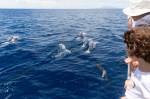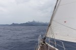 Hatten wir uns auf den letzten Passagen über zu wenig Wind beschwert, werden unsere Gebete heute erhört. Eine Regenfront kündigt sich an. Natalya kommt mit der Idee, die Segeln präventiv zu reffen, den Niedergang hoch. Kaum fangen wir an, die Genua einzurollen, trifft schon die erste Böe mit über 20 Knoten ein. Dabei kommt der Wind genau aus der Richtung in die wir fahren wollen. Also Genua komplett weg und Fock setzen und kreuzen. Schnell ist das Meer aufgewühlt, wir stampfen hart am Wind in die Welle. Kurz vor dem Ziel besuchen uns wieder Delfine. Die Kinder meinen es sind die gleichen: das Tier mit der umgeknickten Flosse ist wieder da.