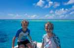 Am nächsten Morgen, bei strahlendem Sonnenschein wirkt der Platz fantastisch. Die Intensität des Türkis kennt keine Grenzen. Da man diese Farbe in der Natur kaum woanders findet, wirkt sie anziehend. Während sich die Kinder am Vormittag mit ihrer Schule beschäftigen, fahren Natalya und Thomas zum Riff. Die Vorderseite des Riffs entpuppt sich als Enttäuschung: alles tot, versandet, begraben. Doch auf der Rückseite, im Tiefem wachsen meterhohe Korallensäulen. Die Fische hier sind auch größer als anders wo. Ein metallisch schimmernder, silberner, mindestens einen Meter langer Tunfisch gleitet an uns vorbei, ohne besonders scheu zu sein. Bunte Rifffische aller Art schweben über den Korallen. Zu großen Freude von Natalya ist heute kein einziger Hai unterwegs. Oder doch? Als sie hundemüde nach einer Stunde im Wasser ins Dinghy klettert, guckt ihr ein neugieriger Schwarzspitzenriffhai gespannt zu.
