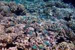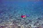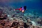 Der erste Sprung ins Wasser bedarf einer kleinen Überwindung. Natalya lässt nur ungerne die Dinghyleine los. Thomas zieht das schwere Boot hinterher. Leider können die Bilder und Videos, bedingt durch fast vollständige Verschwinden des Rotanteils im Sonnenlicht mit zunehmender Tiefe, nur bedingt die Realität wiedergeben. Das Auge bzw. das menschliche Gehirn ist flexibler als eine Digitalkamera. Die Sicht ist so klar, dass wir die Tiefe eher durch die uns bekannten Fischarten einschätzen können. In 10 Meter Tiefe wirken sie schon ziemlich klein. Einige richtig große Fische, die wir noch nie gesehen haben sind dabei. Ein dünner grauer, etwa 1,5 Meter lang; einige dicke Barsche in fröhlich tropischen Farben, mit intensiv leuchtenden blauen Punkten. Als wir an die flacheren Stellen kommen, kehrt die Farbintensität zurück, die Korallen leuchten auf, die Fische glitzern in der Sonne.