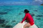 Auf dem Rückweg von Baie d’Avea zum Pass ein paar Tage später möchte Thomas Natalya einen Gefallen tun und nicht genau auf dem alten Track fahren, sondern lt. Seekarte tiefere Stellen ansteuern. Natalya steht währenddessen am Bug und schaut relativ entspannt wie bunte Korallen sich auf sie zubewegen, in der festen Überzeugung, es sei hier tief genug, schließlich sind wir einmal schon ohne Probleme durchgefahren. Doch dann kommt ein Stoß, eine leichte Erschütterung durch das Boot. Die Karte und der Tiefenmesser zeigen falsche Werte an, wir haben eine Koralle leicht berührt. Natalya macht sich die Vorwürfe die Stelle nicht gemeldet zu haben. Zum Glück ist nicht Schlimmes passiert. Es haben wohl 5 Zentimeter an Tiefe gefehlt, um ohne Berührung durchzukommen. Wie leicht wäre das Leben auf einem Katamaran mit 70 Zentimeter Tiefgang! Ohne weitere Zwischenfälle erreichen wir den Pass und nehmen Kurs auf Raitea.