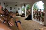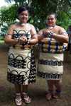 Direkt vor uns formt sich eine Gruppe Mädchen und Frauen, die sich auf den Tanz vorbereitet. Sie sind traditionell bekleidet, mit Federn und Muscheln aufwendig geschmückt. Damit ihre Haut geschmeidig und glänzend aussieht, reiben sie sich reichlich mit einem gut duftenden Öl ein. Nicht allen Tänzerinnen ist es recht, in so einer Tracht fotografiert zu werden: manche verstecken sich vor der Kamera aber ein paar präsentieren sich bereitwillig. Schließlich werden sie ins Haus geladen und gehen singend und klatschend hinein. Ihr Einzug wird von lauten Johlen der älteren Frauen aus dem Publikum begleitet. In Tonga trennt man sich von der Vorstellung, Prinzessin sei ein zierliches, blasses Mädchen. Stattdessen erblicken wir eine deutlich übergewichtige Frau, die mit einem ziemlich ausdruckslosen Gesicht und einem aufgesetzten Lächeln der Vorstellung beiwohnt.