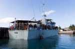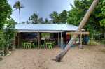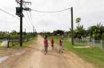 Vom Pier führt eine kleine staubige Straße ins Dorf. Sobald wir an einem Haus vorbei gehen, werden wir herzlich begrüßt. Vor einem der Häuser hüpft ein halbes Dutzend Kinder auf einem großen Trampolin. Ihr Englisch reicht nur für „hello“ und „bye bye!“, und das üben sie fleißig. Einige Häuser sehen nagelneu aus: sie sind alle identisch, sicherlich als Fertighäuser im Rahmen des Wiederaufbaus nach einem Zyklon von Australien oder Neuseeland geliefert. Es gibt sogar zwei kleine „Supermärkte“: kleine vergitterte Kioske. Einer davon hat Wassermelonen im Angebot. Schade, dass wir kein Geld mitgenommen haben.