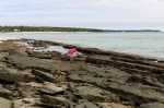 Die Insel ist recht schmal, und so gelangen wir schon nach wenigen Minuten zur Luvseite. Das Wasser hier ist glasklar, der ständige Wind hat für große, sanfte Sanddünen gesorgt. Leider wird dabei allerlei Plastikmül angespült: Flaschen, Schlappen, Bojen und sogar eine amerikanische Wettersonde. Sie hat aber einen langen Weg hinter sich …