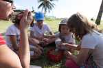 Heute wollen wir nicht die zwei Meilen zu dem tollen Strand von Nukunamo fahren und gehen lieber am alten Steg vor dem Dorf direkt an unserem Ankerplatz an Land. Die Kinder bauen sich im Dickicht am Strandrand einen Verschlag aus Zweigen und Palmenblätter. Wir beobachten die Dorfbewohner, vier Frauen und einen Mann, die mit scharfen Messern und Taschen um die Hüfte durch das flache Wasser waten und nach essbaren Muscheln und Schnecken suchen. Nach etwa zweistündiger Arbeit haben sie einen kleinen Eimer voll gesammelt.