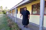 Vor der Schule treffen wir noch während der Schulzeit einen der Lehrer. Er heißt Paula, trägt einen traditionellen schwarzen Rock und wiegt bestimmt fast 150 kg. Die Dorfschule wird in diesem Jahr von etwa vierzig Kindern im Alter von 6 bis 11 Jahren besucht. Jeweils zwei Klassenstufen werden in einem Klassenraum unterrichtet. Paula hat die ältesten Kinder, die Klassenstufen 5 und 6. Als wir ins Klassenzimmer schauen, sehen wir ein Dutzend Kinder in klassischen Sitzbänken sitzend. Wie überall in Tonga tragen alle Schulkinder eine einheitliche Schuluniform. Die Jungen eine kurze, beige Hose mit einem kurzärmligen Hemd, die Mädchen ein rotes schlichtes Kleid. Die Wände des Klassenzimmers sind mit selbsgebastelten Plakaten voll.