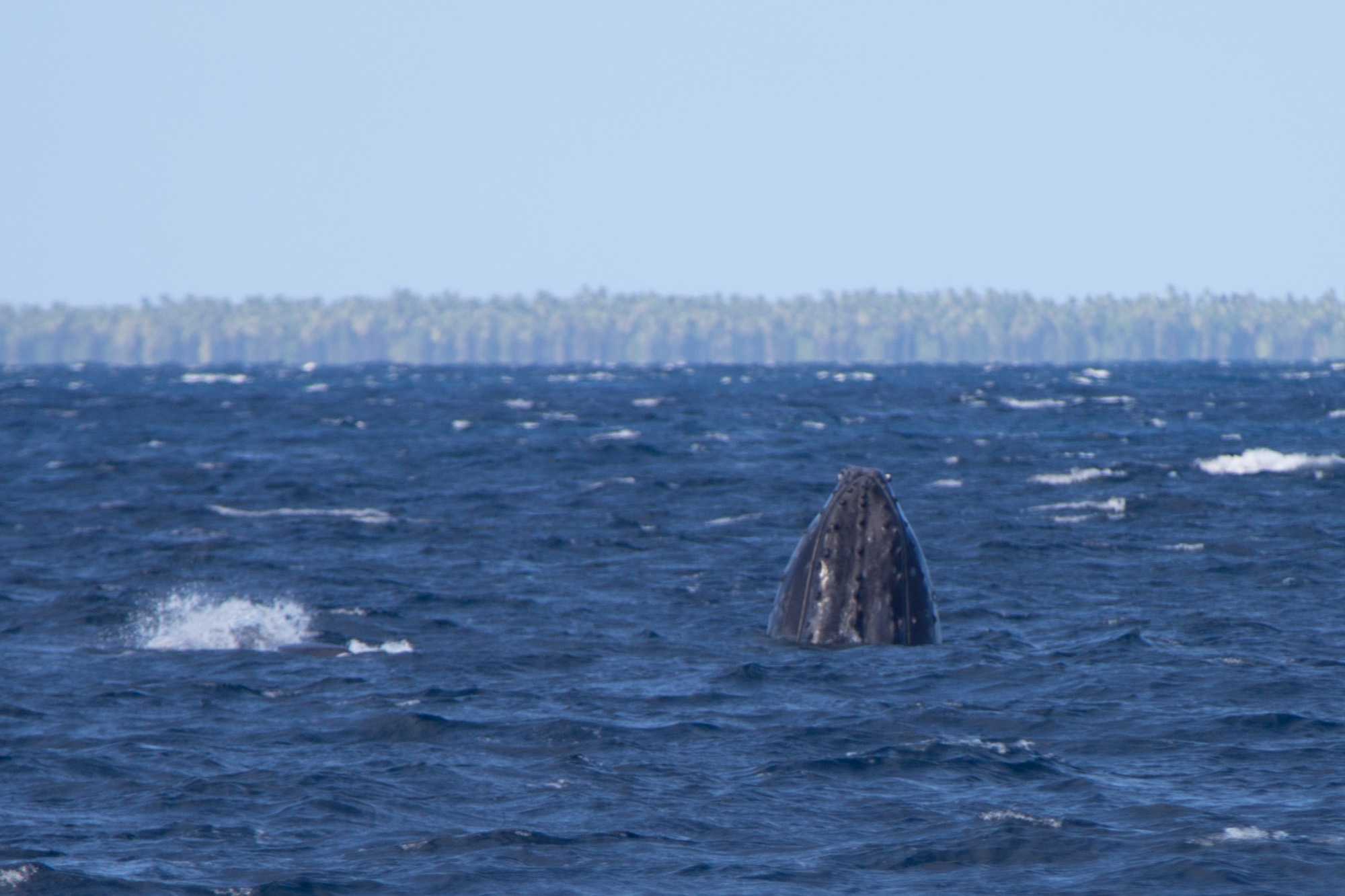 Ein Männchen senkrecht im Wasser – links ein Weibchen