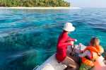 Unsere Kinder haben den Strand so lieb gewonnen, dass sie unbedingt noch mal dorthin fahren müssen. Dieses Mal verhält sich die Welle anders, was wir leider zu spät bemerken. Aufgrund der gestrigen Erfahrung nähern wir uns ziemlich sorglos der Insel … und realisieren zu spät, dass an dem die Insel umgebenden Korallenriff die Wellen brechen. Die Kämme sind von Luv aus kaum zu sehen. Die erste Welle dreht das Dinghy quer zur Welle während die nächste schon das Dinghy überflutet und fast umkippt. Den Kindern ist die Situation gar nicht geheuer, sie würden lieber umdrehen. Aber dazu ist es jetzt zu spät. Im flachen Wasser über den Korallen lässt sich der Motor nicht mehr verwenden. Franka bekommt den Befehl, schnell Wasser zu schöpfen. Dann schnappen wir die Paddel und rudern zuügig zum Ufer, hinter das Riff, in ruhigeres Wasser.