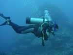Da wir das letzte Mal vor mehr als einem Jahr tauchen waren, ist Natalya ein wenig aus der Übung und muss sich erst mit der Ausrüstung zurecht finden. Gegen Ende des Tauchgangs, als die Gruppe in 30 Metern Tiefe durch einen engen Unterwassertunnel schwimmen möchte, kommt sie gar nicht mehr so tief. Die Luft aus dem Tank ist schon fast weg, und ihr fehlt ein Kilo Gewicht. Unser Tauchlehrer ist auch zu entspannt um nach hinten zu schauen und bis 6 zu zählen. So bleibt Natalya nichts anderes übrig, als über dem Riff den Luftblasen, die aus dem Tunnel aufsteigen, zu folgen, um die Gruppe nicht aus den Augen zu verlieren.