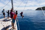 In den nächsten Tagen ziehen sich die Eltern zurück und melden sich nur wenn Essen oder sonstige Hilfe verlangt wird. Russel von SY Tika bringt unseren Kindern Windsurfen bei. Thomas setzt sich ins Dinghy uns zieht länger als eine Stunde Kreise, bis alle freiwilligen das Wasserskifahren ausprobiert haben. Die meiste Zeit verbringen die Kinder aber unter sich. Sie erzählen recht wenig, was sie machen, wirken aber sehr glücklich und zufrieden. Nur manchmal übermannt sie die Müdigkeit.