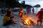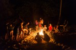 An Land wird ein Junglecamp aufgebaut. Einige haben ihr eigenes Zelt mitgebracht. Unsere Großen haben nur Schlafsäcke, müssen sich erstmal durchfragen, ob jemand einen freien Platz hat. Einige Kinder schlafen in Hängematten. Während die Kinder mit ihrem Lager beschäftigt sind, gönnen sich ihre Eltern ein Bier am Lagerfeuer. Dann ziehen sich die müden Erwachsenen zurück. Bis nach Mitternacht hört man die Stimmen aus dem Zeltlager.