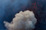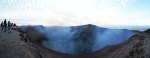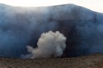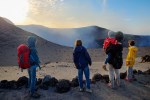 Schon in der Dämmerung steigen wir am Fuße des Vulkankraters in einen anderen Jeep um, und werden direkt bis zum Kraterrand gefahren. Nur die letzten Hundert Meter müssen wir hoch laufen. Schon von weitem steigt uns beißender Schwefelgeruch in die Nase. Auf den ersten Blick macht der Berg einen sehr unspektakulären Eindruck: es ist kein perfekt runder Kegel mit einer Schneekappe, sondern ein relativ flacher loser Schutthaufen. Es dauert nicht lange bis vor unseren Augen die ersten glühenden Lavabrocken hoch in die Luft fliegen. Die Touristen können ihr Glück kaum fassen, alle Kameras werden sofort auf den Krater gerichtet. Mehrere kleine Eruptionen folgen kurz auf einander. Des Stehens müde setzten wir uns an den Kraterrand und spähen gespannt in den Krater hinunter. Obwohl uns ein eiskalter Wind um die Ohren pfeift, ist der Boden angenehm warm. Während es unten, die nächste Explosion ankündigend, rumort, fängt der Boden unter uns zu vibrieren an. Immer wieder fliegen glühende Felsbrocken in die Höhe begleitet von lauten Verpuffungen.
