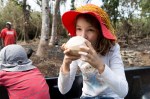 Schon gegen Mittag, als die Kinder kurz davor sind, nach dem Mittagessen zu fragen, kommt der Jeep, in den wir einsteigen dürfen. Eine gewundene Piste führt weg von der Küste ins Landesinnere. Der Wald ist ziemlich dezimiert, große Bäume gibt es nicht mehr. Aber am Ende der Piste sehen wir das ursprünglichste Dorf überhaupt. Hier wohnt nur eine Familie, mitten im Nichts. Bis zur nächsten Siedlung sind es Dutzende Kilometer auf dem Waldweg – zu Fuß versteht sich. Während Joseph sich mit seinen Verwandten unterhält, schauen wir uns um. Zwei kleine Kinder löffeln am Boden sitzend ihr aus Reis bestehendes Mittagessen aus einer Metallschüssel. Die Mutter beschwert sich bei uns, die Kinder sind wählerisch und mögen das lokale Essen nicht. Um die Hütten herum liegt die Handarbeit der Frauen. Sie sammeln Blätter des Schraubenbaums, eines nach einer kleinen Palme aussehenden Baumes, schneiden den dornigen Rand ab und hängen sie zum Trocknen auf. Daraus werden allerlei Alltagsgegenstände geflochten: Körbe, Taschen, Kisten, Matten.