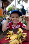 Natalya begibt sich auf die Suche nach frischem Gemüse und ist von dem lokalen Markt ganz angetan. Frische zarte, heute früh erst geerntete Salatköpfe werden zu zehnt auf einem Grashalm aufgefädelt verkauft. Beim ersten Kauf ist man noch unsicher, ob der ausgewiesene Preis für einen Salatkopf oder für den ganzen Spieß ist – nach den Preisen auf den sonstigen Pazfikinseln wäre der Zehnerpreis selbst für einen Kopf noch akzeptabel gewesen, für alle zehn zusammen aber spottbillig. Frische Tomaten, Auberginen, tropische Früchte türmen sich auf den Verkaufstischen. In einem separaten Bereich stehen große, aus Palmenblättern geflochtene Körbe mit Grundnahrungsmitteln: Süßkartoffeln, Maniok und Taro. Hinter den Gemüseständen findet man Blumenverkäuferinnen mit einem farbenfrohen Angebot an ungewöhnlichen tropischen Blumen. Nur die Suche nach Fisch gestaltet sich schwierig. Natalya schaut in eine Truhe voll bunter Rifffische hinein und hat nicht die geringste Ahnung, was davon man sicher essen kann und was von Ciguatera verseucht lebensgefährlich sein könnte.
