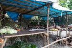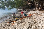 In dem kleinen, übersichtlichen Dorf dauert es nicht lange, bis wir bei Emil ankommen. In seinem Hof wird demnächst eine große Hochzeit vorbereitet. Die Vorbereitungen laufen auf Hochtouren. Die Mengen an Lebensmitteln lassen mindestens Hundert Gäste vermuten, die angeblich auch von anderen Inseln anreisen werden. Kühlschränke für den alltäglichen Bedarf gibt es hier nicht. Die Speis sieht sehr traditionell aus, frisches Obst und Gemüse wird in einem Unterstand auf Stelzen gelagert. Scheinbar gibt es hier keine Ratten, sonst würden die offen liegenden Vorräte keine einzige Nacht überstehen. Schnell verderbliche Waren wie frisches Fisch und Fleisch werden erst direkt vor dem Kochen angeschafft. Für jeden bedeutenden Anlass muss eine bestimmte Anzahl von Schweinen geschlachtet werden. Die Dorfbewohner sind sehr freundlich, laden uns in ihren Hof ein, um die Vorbereitungen näher anzuschauen. Sie haben nichts dagegen, wenn wir ein Paar Bilder machen. Nur ein kleines Mädchen bekommt Angst vor dem weißen Mann mit einem großen schwarzen Gerät in der Hand.