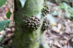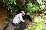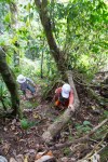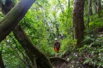 Emil erklärt sich bereitwillig bereit, mit uns morgen auf den Berg zu steigen. Über sein Honorar sprechen wir nicht. Es wird schon nicht so teuer sein. Leider ist der nächste Tag bedeckt und es nieselt leicht. Wir hoffen, dass es schon nicht in Strömen regnen wird und gehen trotzdem den Berg hoch. Im dichten Wald lässt sich der Regen kaum spüren. Die mächtigen Kronen der Banjanbäume schirmen die Tropfen fast komplett ab. Zu ihrem Glück sind diese Bäume mit ihrem weichen unregelmäßig wachsenden Holz kaum wirtschaftlich von Bedeutung. Wo Sandel und Kauri abgeholzt worden sind, blieben die Würgefeigen stehen. Manche Kronen erreichen die Größe eines Fußballfeldes. Unser Pfad verläuft entlang der dünnen schwarzen Wasserleitung, die das Dorf mit Wasser aus den höher gelegenen Quellen versorgt. Der Weg ist ziemlich steil und wird mit dem fortschreitenden Regen zunehmend rutschig. Aber der Aufwand hält sich in Grenzen und wir kommen schneller als erwartet zum Gipfel.