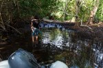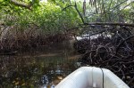 In der Zeit unserer Abwesenheit ist die Flut zurückgekommen, so dass unser Dinghy jetzt in tieferem Wasser liegt. Wir werden beim Durchwaten des Schlamms nass, dafür lässt sich das schwere Boot leichter aus dem Wirrwar der Mangrovenwurzeln herausmanövrieren. Nur gut, dass wir nicht zu lange gewartet haben. Sonst wären wir unter den tief hängenden Zweigen der Mangroven nicht mehr durch gekommen.