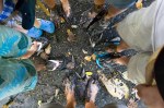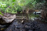 Da die Bucht von Gaspard Bay ringsum dicht mit Mangroven bewachsen ist und somit keinen richtigen Platz zum Anlanden bietet, gibt es hier auch kein Dorf. Wir sehen allerdings aus dem Wald Rauch aufsteigen, hören eine Axt schlagen. Ab und zu bringt der Wind Kinderstimmen und Lachen bis zu uns. Da unseren Kindern das Leben ohne Landgang auf die Dauer langweilig erscheint, versuchen wir am flachen Ufern der Bucht eine wenigstens einigermaßen geeignete Stelle zum Anlanden zu finden. An einer Stelle sehen wir eine kleine Lücke in den Mangroven und erspähen dort ein kleines Fischerkanu angebunden. Unser Dinghy ist für solche Verhältnisse viel zu schwer. Wir können es weder schwimmend zum Ufer bringen noch durch den Schlamm höher schleppen. Weiter als knietief kommen wir nicht durch. Natalya setzt vorsichtig einen Fuß ins Wasser um zu prüfen, wie tief man im Schlamm versinkt. Der Grund ist einigermaßen fest und man versinkt nur bis etwas oberhalb der Knöchel. Die Kinder folgen, Thomas überlegt sich lange ob der Spaß es wert ist, die Füße in weichem, tiefschwarzen Matsch wer weiß wie tief versinken zu lassen, kommt aber dann doch nach.