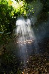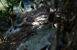 Zweimal die gleiche Strecke laufen ist doof. Wir wählen einen anderen Weg und unter vielen Abzweigungen eine, die ungefähr in Richtung unseres Dinghys geht. Es riecht immer stärker nach Rauch, bis wir einige qualmende Stellen erreichen. Wir müssen besonders aufpassen, dass wir an den glühenden Kohlen nicht unsere dünnen Schlappen versengen. Da nur Holzabfälle und unerwünschte Lianen langsam in einer Art Schwelbrand glühen, gehen wir davon aus, dass die Insulaner auf diese Art ihren Wald reinigen.