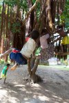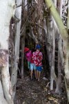 Am zweiten Tag wollen wir uns dann den Turm und etwas der Traditionen ansehen. Chief Sam Eric und zwei junge Männer führen uns zu dem rituellen Platz des Dorfes, der etwas außerhalb liegt. In einen Banjan-Baum integriert ist eine Sitzgruppe, und ein Gang führt bis in das Herz des Baums. Diese Bäume sind eigentlich Parasiten. Sie wachsen aus durch Vögel in obere Äste eines größeren Baums getragene Samen nach unten bis sie Wurzeln schlagen. Dann umwickeln sie den Wirtsbaum so lange, bis dieser irgendwann abstirbt. In dem hier stehenden Baum war der innere Baum sicher über einen Meter dick und hat nur einen entsprechend großen Hohlraum hinterlassen.