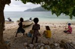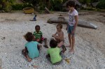 Der Strand vor dem Dorf eignet sich perfekt zum Baden. Arvid in Begleitung einiger Einheimischer seines Altes tobt im flachen Wasser. Die lokalen Jungs sind scheu, gehen zwar ohne Hose baden, bitten aber ihre Spielkameraden vor dem Rausgehen ihnen die Hose zu reichen. Unsere Großen sind mit Basteln von Pfeilen und Bögen beschäftigt und durchkämmen den nah liegenden Wald nach passenden Stöcken. Thomas hilft Arvid und Talora ihre Rüstung zu schnitzen. Eine große Gruppe Schulkinder schaut mit großem Interesse zu.