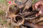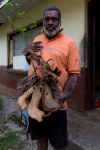 Justin erzählt uns auch einiges über Zeremonien. Um seinen Rang als Chief zu erreichen, musste er im Verlauf der Jahre insgesamt 60 rituelle Schweine schlachten. Die wertvollsten Schweine haben besonders geformte Hauer. Um sie anzuzüchten, werden den jungen Schweinen Teile der Oberkiefer entfernt, so dass die ständig nachwachsenden Eckzähne des Unterkiefers den Oberkiefer durchbrechen. Sie wachsen weiter in einem Bogen, bis sie die Unterkiefer von unten durchstoßen. Die besonders Wertvollen Schweine haben bis zu zwei komplette Windungen der Hauer. Sie können nicht mehr selbstständig essen und müssen sich von den Frauen mit einer Flasche füttern lassen. Die armen Schweine! Alleine kann man niemals so viele Schweine aufbringen. Vor allem für die obere Positionen braucht man so viele Schweine, dass man auf die Unterstützung seiner Familie oder anderer Verbündeter angewiesen ist. Justin zeigt uns einen Bund mit den Kiefern und Hauern der zehn bei der letzten Ernennungszeremonie geschlachteten Schweinen. Für seine Feier wurden mehr als 100 Gäste eingeladen. Für jedes der geschlachteten Schweine muss ein zeremonielles Bäumchen an einer bestimmten Stelle im Dorf gepflanzt werden.