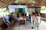 Beim ersten Anlanden stellen wir fest, dass sich nicht nur Natalya Sorgen wegen des Vulkans macht. Da das offen am flachen Ufer gebaute Dorf Asanvari vor dem nicht einmal 10 Meilen entferntem Vulkan wie auf einem Präsentierteller liegt, ist die ganze Dorfbevölkerung in Erwartung eines Tsunamis in die höher gelegen Teile des Dschungels geflohen. Dort kampieren sie in provisorischen Unterkünften und warten bis die Gefahr vorüber ist. Auch Barry, der Besitzer der Fledermaushöhle, ist gerade dort, so dass wir gleich eine Tour für die nächsten Tage mit ihm vereinbaren können. Er wartet auf uns morgen vor dem Wasserfall.